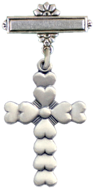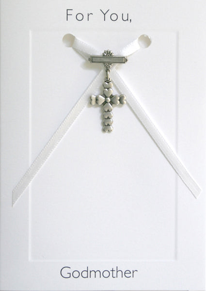3-1/2" x 4-5/8" white fold-over card with a beautiful heart cross pin (antique finish) attached with white ribbon. Back of card includes a prayer for Godparents.
