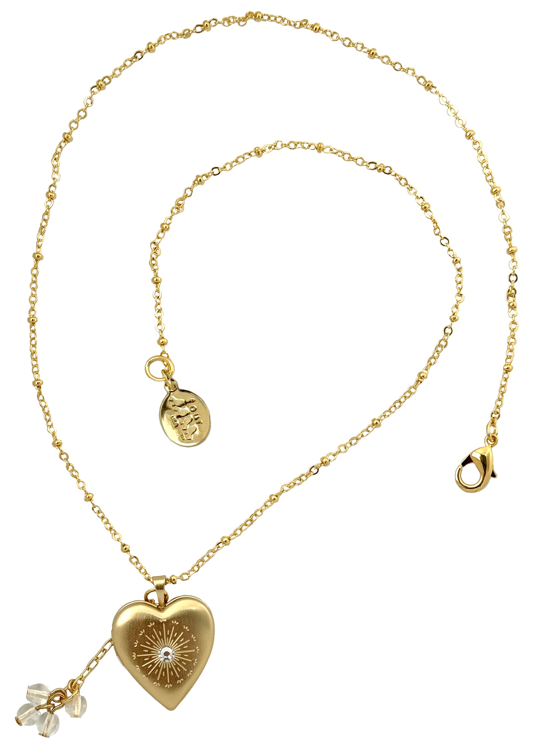 This handcrafted 20mm heart locket with crystal stone in the center of of the dandelion. Four 4mm crystal beads attached to the swinging chain.