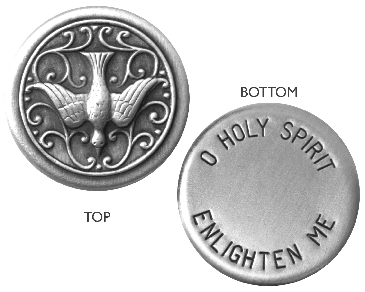 Embossed Holy Spirit is on the top of the lid and the bottom has "O Holy Spirit Enlighten Me" embossed on it.